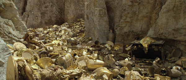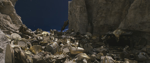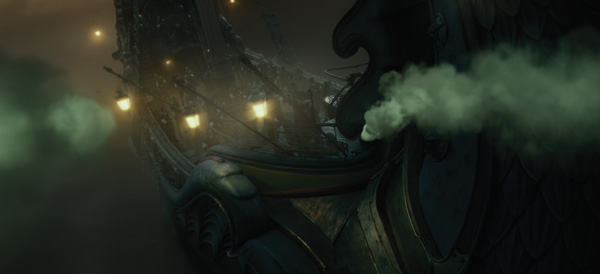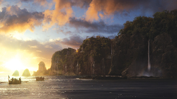 Falling Star "This island contained several important sequences for us. When the character Liliandil transforms from a star, dropping down to the island, the effect results from particle simulations we created to resemble images available to everyone from NASA. Because now people know what a star looks like, we wanted that kind of realism, not a glowing child-like version of a star with solar flares and swirling plasma making her an organic real star. A couple of months of R&D on the particle and fluid simulations were required, using Maya particles and fluids, experimenting with textures, gravity, movement and flow limes. "We ended with five to ten different simulations emitting from a central sphere which we applied to a model derived from a scan of Liliandil that we made our basic mesh from. We placed this where she would be standing to match the contours, and used this same simulation – but emitted from the new Liliandil model without rendering the actress herself, just the emission." The viewer understands that that someone will appear in that shape, before the live action is blended into the emission, when she appears to be emitting the particles herself. This kind of transformation repeats as she reforms into the sphere, throwing off particles and gases similar to a super nova to shoot back up into the sky. Perfect Environment This could be accomplished in 2D but in other views, such as in among the trees, waterfalls and aqueducts, had to be created and embellished in 3D. Extensive background vegetation with strafing volumetric beams of light was also built and could be used through the entire sequence, but almost every shot needed bespoke modelling of its own. The characters return to the island later as well, which made perfecting the environment important. Tricky Mists They built and animated what they called vicious-looking 'eels' to crawl through the scenes. The task then became translating the animation to the fluid simulations in a way that retained that same creepy, snake-like look so that viewers would get a sense of danger and evil, expressed through their movement, pauses and turns. The animations were cached and the fluid simulation was derived from this data. "The simulation itself was created with Cinesite's proprietary fluid software developed in Houdini, called csSmoke. Created for previous films, this was an opportunity to push it further and use it to add character qualities to smoke objects without eyes, voices or faces. Each had three fluid simulation layers and 15 render passes for the lighting including internal glows and three different shadow passes," said 3D Supervisor Stephane Paris Interactive Smoke One of VFX Supervisor Matt Johnson's favourite effects was when the smoke was to pass through a vent or even a solid bulkhead on deck. "As it is hits the surface, a slight displacement of the smoke occurs, as well as a portion that passes through. Creating effects in this manner helps ground them and embed them into the scene better than just having a hard rotoscoped edge," he said. The speed of the animations affected the look of the simulation as well. Accelerating too quickly, for example, could 'kill' some aspect of the smoke's movement, so making the smoke look consistent from shot to shot was not straightforward. For animation reference, realistic smoke action didn't work as well as more mysterious, spooky dancing motion, similar to the looks that effects teams formerly achieved with cloud tanks. During look development, the production wasn't completely clear about the looks they wanted, or even the colour, which meant considerable testing and looking at references from previous films as far back as 'Raiders of the Lost Ark'. Chunky Renders Murky Environment Therefore, they created their own dark, murky environment based on descriptions from the production, giving it colour, creating geometry to define the topology and adding rocks. They also worked with the camera positions to establish continuity from shot to shot. Once they had completed this environment, they shared it with other vendor's teams working in the same part of the story so that all shots would fit together. A green pulsing energy, which they called 'synaptic pulses', was required in the smoke and animated as glows in the background. A further interesting aspect of the backgrounds, essentially 3D environments established in CG, was that the team could handle the matte paintings, 3D geometry and various elements within the 2D compositing stage. Then, using the 3D capabilities of Nuke, they could blur the boundaries between traditional 2D and 3D effects, which they found gave them a greater range of options for handling the shots. Misty Witch They were able to 'roto-animate' or match move this 3D digi-double to emulate the Witch's performance on set, frame by frame. That, in turn allowed them to digitally create and then animate her hair to give a flowing, misty look – all derived from the 3D maquette, which Stephane's team rendered with the required passes. They could use these hair and body animations to produce their own distinct kinds of smoke. In the compositing stage, they worked on the look of her face, softening and smoothing it. A 'pro-mist' version of the face was created using a camera filter to take away lines and edges, making her both more ghostly and ethereal, and her performance more tempting and seductive. Some parts of the face faded out and back in, like the smoke, but they always focussed on the eyes, adding a green tint to them. Her internal illumination was rendered in the same way as the mist. In the end the viewer is not certain if she was a real ghost, come to torment Edmund, or purely a misty figment of delusion. Glittering Bling At Narrowhaven, all buildings extending up a hill into the background are part of a CG environment the Cinesite team created with Moroccan-style architecture. Layout and placement of buildings of varying designs and looks were accompli