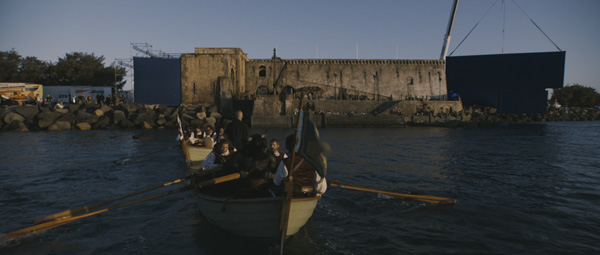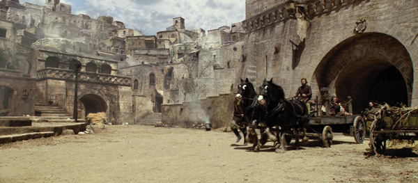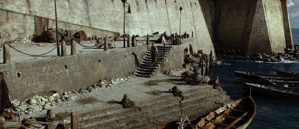 The Senate VFX completed 250 exciting shots for 'Dawn Treader', 215 of which appear in the finished film, covering full-scale CG environments to embellishments to bring some of the magic to Narnia. Spitfire "The crew wasn't able to achieve the first part of the shot, but we did manage to create moves that simulated the way a crane moves in terms of tilt, pitch and height, and stitched the live action camera onto their 3D camera," explained VFX Supervisor Richard Higham. Consequently, the first part of the shot is the invented camera, and the second part is live action, still displaying our 3D buildings in the background. The only real objects in the scene are the people crossing the road, the road itself and the railings. The buildings are all CG – the gatehouse and walls, King's College chapel and other college buildings – requiring extensive detail and time." Turning Blue They were able to follow the previs'd camera move right down to where the real camera began, shooting people on the street. The idea was to let the audience wonder for a few moments whether they were already in Narnia, revealing only the colourful stained glass window, stone structures, spires and ramparts. But the Spitfire was their first clue of England, also created by The Senate VFX team. Unfortunately, no architectural layouts or drawings for Cambridge University were available, which is why they needed so much photography. Michael Apted had spent some years in Cambridge and wanted a very accurate result. They had to calculate positions from multiple photos and correct distortion in others shot with different lenses, using tools in Photoshop and their compositing software. Bell Tower The artists based their model on another they had built for 'The Da Vinci Code' for the Council of Nicaea shot. The team handed over the model to the Art Department to experiment with and modify, and when it came back, they touched it up and textured it, and added shaders. "In this environment, I think the decision to use a full 3D environment was smarter than adding 2D elements because we could give it more scope and a sense of depth, including light. Of course, without blue screen, everyone had to be individually rotoscoped out throughout the sequence and the new background placed behind them." |