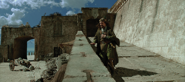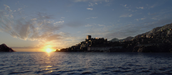 Animated Geography As Coriakin talks to them about the map and he walks over the water and among the clouds, his feet interact slightly with the surface, which is slightly resilient like as LCD screen, and the clouds swirl and wisp a little around his legs. The only way to introduce their work for this map was to rotoscope him out of the footage. The map consisted of the ocean, the islands at different scales, and fluid simulations to create the clouds. Fortunately they didn't need to create water interactions, only the LCD effect. The islands are animated throughout the sequence – the map moves along for the viewer rather the way a microfilm search machine moves to and enlarges an area of interest. As Coriakin described a location, such as Ramandu's Island, the map would zero in on it as it came to life. This was achieved by flying the camera low over the ocean toward the island as if the viewer was approaching it, but as the camera came up over the top, he realizes that it is still just a map in a room. Dropping down through the clouds added a similar stylistic touch, at which point they handed the shot over to another facility to finish the progression. Camera Matchmove "We were using the live action camera, but on all 3D shots we created our own cameras for the projected environment, matchmoving back to the real camera. In fact, every time we put 3D into a shot, unless that camera was fully locked off, they needed to matchmove the cameras, ensuring the parallax, perspective shift and other factors are identical. The 3D camera has to be a matchmove camera solve from the live action." |