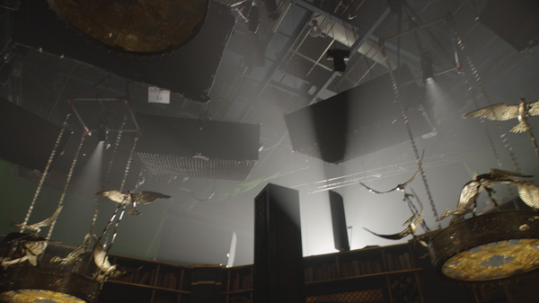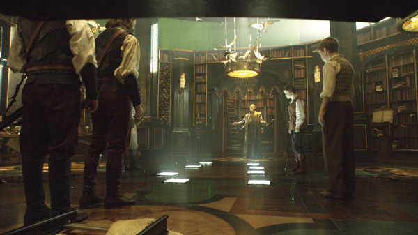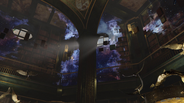 | Interior Weather When Lucy Pevensie enters the enchanted house of the magician Coriakin, she finds herself in his library where she reads from a book of magical spells standing on a lectern. As she blows the dust off of it, a jumble of letters on the cover suddenly animate and rearrange themselves into the book's title, 'The Book of Incantations'. As she opens the book and reads one of the spells, a snow flake drifts down onto the page – added in 3D CG. From there, the camera shifts into a reverse angle looking up at her, and when it changes back again and she looks up, a completely 3D CG environment of the library itself is revealed, this time with falling snow and clouds, resulting from the spell she read out that has brought the weather system inside. The entire library was built and modeled in Maya, based on the production's working 3D model. |