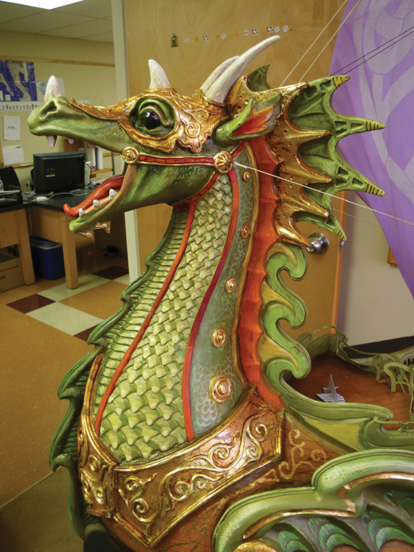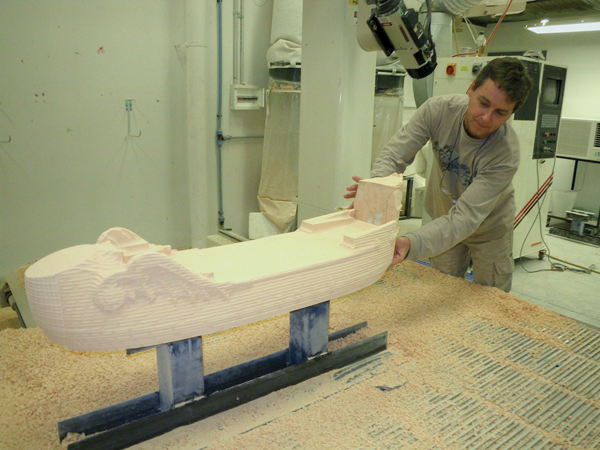 The .dxfs were emailed off site for polystyrene profiles to be hot-wire cut for the balustrading, head, tail and wing. Set Designer Chris Tangney neatened and updated the balustrading and rear balcony using Maya, and the final model was milled accurately from this file by John Cox's Creature Workshop.
