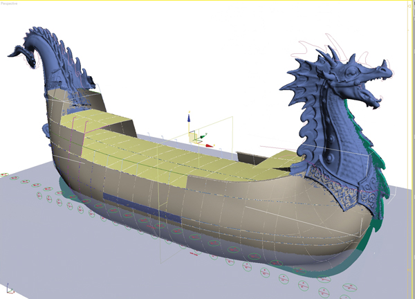 Having the virtual camera means we can take a view from anywhere using any size lens - from the top of the crow's nest looking straight down to the deck, or a far off view of the entire ship looking from the shore. These give a basic layout for composing illustrations. The Art Director in Mexico, Marco Niro, was very knowledgeable about ship design, why ships are shaped as they are, and the names of the parts of a ship to help avoid ambiguity. In addition to positioning the oar holes and rationalising how the railing blended into the dragon's neck, Marco set out the hull and decks by applying logical, ordered geometry.