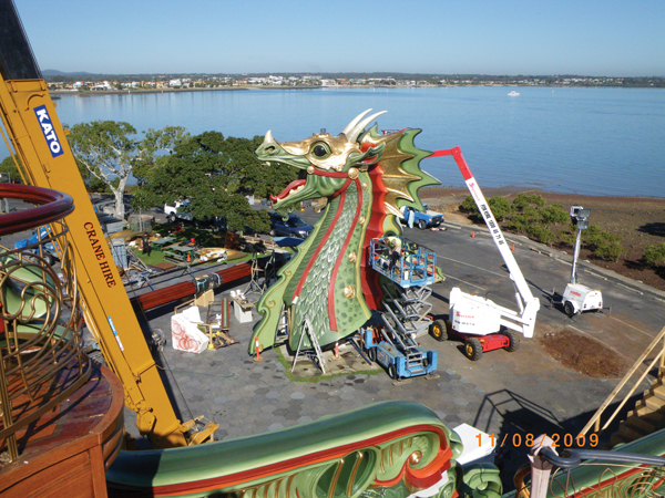 Described as having a dragon's figurehead and a purple sail, the ship went through an incarnation from an Art Department in the UK before Barry Robison took over as Production Designer. He proposed a hull shape similar to a ship of the class and form of ‘The Endeavour’. He sketched the Dragon's head on the prow, from which Sculptor Jiang Liu modelled a 1:33.3 scale plasticene maquette. Set Designer Kristen Anderson modelled the hull in Rhino, researching typical ship sections and profiles. Working with Jiang, she ensured that the hull she was lofting matched where it joined to the plasticene prow and tail.