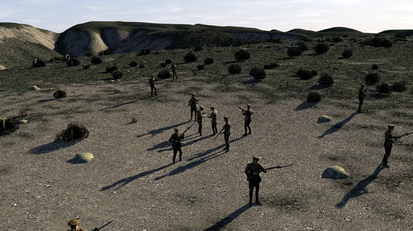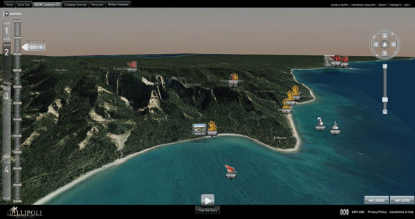 Getting Armed Adobe Flash 10, new at the time the team started planning and able to support 3d animation, made the project seem more feasible. Senior Flash Developer Robert Stewart compiled a bridging program to use Flash 10 as their 3D animation environment. The terrain-based theme was maintained, but they found they had so much information, ranging from military strategy to the soldiers’ personal stories, that Sam Doust decided confining it to the first day, moment by moment, introduced to users through the Guided Tour, was the only way to get through it and meet the deadline. Harvey Broadbent, an authority on the Gallipoli campaign, supervised the collection of information, strategy and historic detail on the day to ensure accuracy and impartiality for both sides. His in-depth understanding allowed the team to plot the course of events, movement of people and connections between them, across the terrain. Sam took on the role of producer, editor, director and script developer armed with the full Adobe CS4 Suite and Flash 10, with the Flex web application framework, as his 3D environment. Google Earth, although only containing modern geographical data, was used as a development tool to integrate the latitude/longitude data. His team exported KML files containing coordinates to Google Earth to locate the specific events they wanted to place on the site.