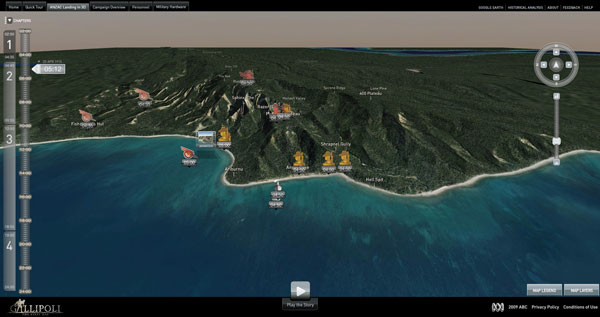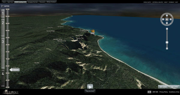 | The site shows visitors what happened at Gallipoli, moment-by-moment from the early hours of the morning, during the landing and as fighting commenced. You can access animated scenes, videos of interviews with soldiers and officers, archival images, photos and detailed information on weaponry and most important, 3D terrain data for all events, linked to the time of day. The result is feeling as though you had been at Gallipoli yourself.