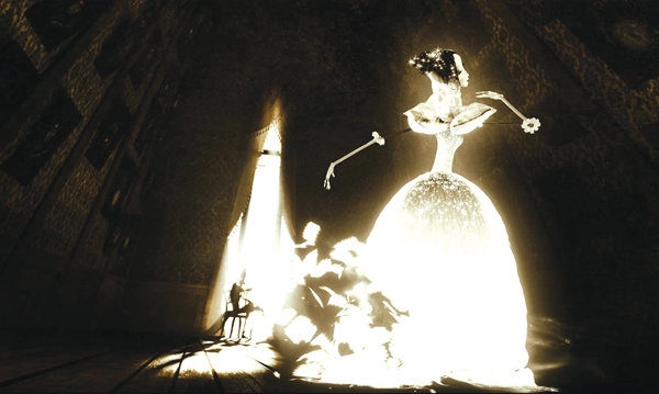 The corridor was actually re-built in CG, based on the clean plate which had been lit and shot as it should appear. They could derive their lighting from this and use the recreated geometry to cast shadows and control the interactions with dust and particles against the walls and picture frames.