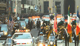 Funeral Procession In a later sequence, Salt leaps from a New York subway train and escapes through a hidden door into the crypt of a large church in Park Avenue where the US Vice President's funeral is to be held. Ivan’s team shot plates of the moving train and the section of the subway where she jumps out, with the train moving in the background. Later, she was shot on a subway carriage on blue screen. For the actual jump, a stunt actor was shot on blue screen moving along on a cart-like mechanism that they matched to the speed of the train on the subway. As she jumps and lands, they did a similar trick as on the freeway, morphing through to Angelina herself as she finishes a roll onto camera, again making it appear as one actor and one shot. Salt needs to reach the crypt to await the arrival of the funeral procession outside in the street, where Framestore created extensive 3D crowds. The set was also extended to make the street much longer and the procession much bigger. “Phillip was looking for a feeling of grandeur for the event, and we added a number of CG vehicles as well as policemen and various blue screen effects elements,” said Theo Jones, CG Supervisor.