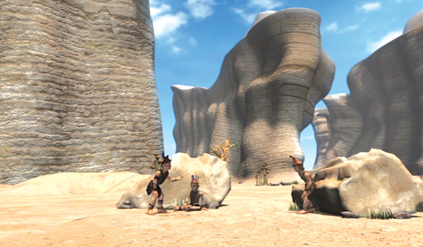 The characters had to resemble human beings enough for viewers to identify with them, but still look exotic and interesting enough to be recognisable as a different 'race' and hold the audience's attention. "We researched tribes from around the world as reference, but generally found they were all too distinctive and colourful in their dress and decoration. Our brief from the original concept creative was to give the tribe a muted colour palette, blending in with the harsh dry land. We also tried to portray all Doodjie people as equals in design and costume, most wearing very similar armour and dressings. However, a lot of effort was put into the three young lead characters' faces and expressions, giving each a unique look but, at the same time, keeping the differences subtle.