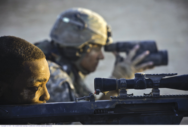 | We looked at some references to find out exactly what the view through a scope would look like. Gavin Milkovich here added elements on the Flame system, a dark vignette and distortion around the sides, to about 20 to 25 shots. Flame has better distortion tools than Smoke, and at that time, had a more powerful batch compositing environment, although Smoke has improved by now.”