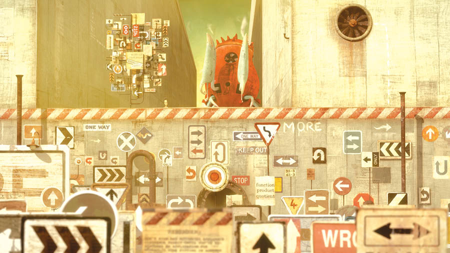 Hand-Painted Textures The brief from Shaun regarding the textural look and feel of the whole project was to make the models “like puppets”. The textures were designed not to look exactly like the intended surface but more to be 'representative'. For example, rusty pipes weren't textured using photographic metallic rust source material. Instead, Shaun provided high res scans of hand-painted texture source material, which were representative of the surfacing that he wanted to be used on the characters, environment surfaces and details that he'd like to see in the film, like signs, wording and so forth. Tom used these to construct the actual surface textures for the 3D models, sometimes directly, using areas of the texture scans, re-arranged to fit the UV layout of the 3D models. Often, especially on the environments, combinations and variations of several were used to provide a wider range of surfaces and to prevent the viewer from noticing textures repeating and appearing in more than one environment. He also often incorporated areas of actual photographed real-world textures to add more detail and variation.