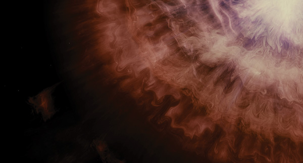 Inspiration Dan Glass was thrilled at the opportunity to work with Terrence Malick, a director who had inspired Dan to get involved with movies to begin with, but when he got started in visual effects, he found himself working on an entirely different type of film than those Terrence was making. Terrence wanted to tell a history of time, covering many unphotographable concepts by using analogous photoimagery, such as terrain that can stand in for different periods of time or live action material that suggests extreme scales and scenes that most people imagine but never actually see. A strong element of the brief was using symbolic, suggestive images instead of CG. Dan’s background is in compositing, so a challenge to hide the film’s VFX to a large extent appealed to him. “What is hopefully evident in the result is a collection of practical components. That may lead to a conclusion that digital elements have been minimized, but in fact they play a greater role than people recognise. We took a cautious approach with a goal of authenticity and naturalism, more like found artefacts and events,” he said. Rare Chance This was a rare chance to help interpret the visual aspects of scenes in a film, where and how it took place. The VFX work on the film was divided into four realms, handled by different facilities. A dinosaur sequence representing earth’s natural history was completed at Prime Focus, supervised by Bryan Hirota and Mike Fink from their Vancouver studio where the animation was done, with compositing and other work done in Winnipeg and Los Angeles. Building Dinosaurs Terrence actually prefers not to use previs or even storyboards because they seem cold and unemotional to him. But the team did do some of their own for the dinosaur sequence though it wasn’t precise in terms of lining up shots for the CG. It was more for the flow and idea behind the whole sequence. For example, previsualising a scene in which a young dinosaur collapses into water helped them decide on the riverbed location and how it should look. Consultants helped choose modern creatures to base the animation on, and even skin colours and textures. The nature of all of the teams’ work required a huge amount of research, not just for the dinosaurs. Specialists including biologist Lynn Margulis and paleontologist Jack Horner were consulted. Sustained Performance Prime Focus worked on the creatures in 3ds Max, sculpting with Mudbox. Their priority was the animation. The length of the shots demanded sustained performances, but not lots of movement or action. They needed to avoid over-animating the dinosaurs, and just letting them behave like animals. The sculpted models were exported from Mudbox back into Max for texture painting, rigging and animation. Dan said, “Water interactions had to be created in some shots, such as when a Dromiceiomimus, a predator, attacks the smaller Parasaur in a puddle. More extensive, subtle water work was done as a wounded Plesiosaur, washed up on a beach, raises its flipper causing ripples and splashes that integrate it into the plate.” The dinosaur sequence comprises about 80 to 90 fairly long shots. Experimental Elements They held three long weekend shoots during the post schedule devoted to such work at a studio they hired near Malick’s home in Texas. Photographic FX supervisor Doug Trumbull joined them to set up experiments – from liquid nitrogen to fluids and dyes in tanks to flares set off under water, lens flares shot through a peep hole arrangement and many others. They heated up ball bearings and other objects, and watched them cool down. All of this was used to compile an array of elements they could put together later to form shots. True to science Celestial Bodies “Early in the sequence are some shots depicting the birth of the first stars – Population III stars – built up from some powerful simulations based on current theories about this era,” Dan explained. “But these scientific simulations look very sparing on detail, so our challenge was to take those with their core data and turn them into something more dramatic. I commissioned a concept artist George Hull to paint frames that Double Negative combined with the scientific data to construct their shots. It was yet another technique, but still based on science. Abstracted Stars “I suggested to the concept artist the idea of painting the scene as a vast cavern on a truly massive scale with explosions lighting the interior. The cavern would represent the interior of the star and the ‘space’ around it would be the compressed matter of the universe. We also kept true to the scientific palette – red walls for the caverns but the light itself would be blue-white. To suggest a vast enough scale, similar to a nebula, we used cloud-like textures for the walls.” At Double Negative, Shake and Nuke were used for compositing, and Photoshop to extract and clean up the Hubble imagery. They used Maya to construct layers for the 3D but much of this task was also handled in the composite. The local team in Austin, who helped break shots into layers and re-project them, did a lot of their work in Nuke as well. Living Microbes One of Us based their microbial work closely on real microscopic footage showing such processes as cell division. But because these are very flat, pressed onto slides, the images show little depth. “For reference, they used some electron microscopy, which shows the full depth but has to be used on dead cells. The team had to take these combined resources to create images with both depth and a living process. Much of the content had to be CG, while capturing the phenomenon graphically. One of Us built their backgrounds by shooting liquid suspended in tanks to show wide panoramas, with depth and light spilling through it. These were combined with CG elements to introduce depth and detail. Textures were shot from rust and other real textures, to give the composite a feeling of real 