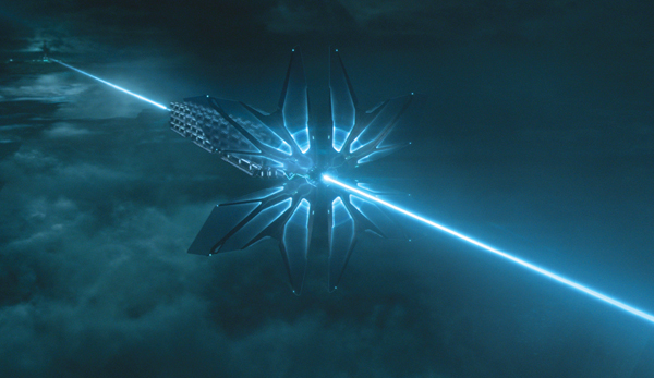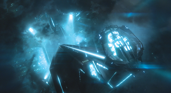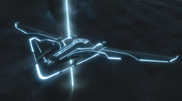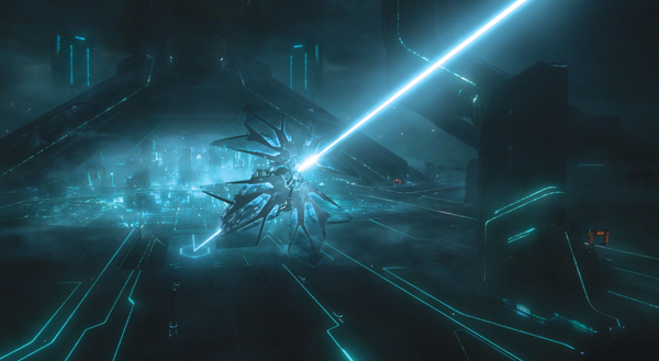 TRON Rules In some cases, the team had plenty of concept art. For others, there was next to none and they needed to flesh out their shots according to the established rules. Because Digital Domain had been directly with production from the start, Prime Focus' artists could focus immediately these tasks instead of first undertaking an extensive R&D and concept stage as they normally would. Solar Sailer They were given three pieces of concept art for the Solar Sailer, along with a rough model used for previs. What its design needed was what the production called richness – subtle detailing to not only communicate the practical, technical nature of all elements inside TRON but also its large scale, a quality the base asset lacked. “While there were several practical set pieces for the Solar Sailer, no single, master set piece was made,” said DFX supervisor Jon Cowley. “As result, portions of the set, for example sections of the cargo pods, were shot live action that we, in turn, had to match in CG on our platform-only set. Other parts of the vessel like the sails only existed as concept art and we had the flexibility and freedom to further develop the look, movement and energy pulses associated with them.” Modelling for the ship was done inside Maya and Mudbox, and at times with ZBrush. Speed and Distance The brief stipulated that the ship should move very fast, on an essentially straight line at a constant speed, and at an altitude of 10,000 feet. At this height, of course, objects on the ground scarcely appear to be moving, and they needed a means to create more interest and a sense of motion and speed. They added some flex to the sails, for example, but what was most effective were the quantity of atmospheric elements the artists layered into the surrounding space. In the end, a huge number of these atmospherics was required, and creating and managing them became a major part of their work. Adding atmospherics meant dealing directly with stereo requirements. The team couldn’t employ some of the 2D techniques typically used for atmospherics, such as putting footage of clouds or smoke on cards. “In a volume of this size, given the amount of depth we had to convey, everything had to be 3D CG and had to be rendered,” said Jon. “It’s amazing what can happen. When something like a cloud is completely out of focus off in the distance, if it isn’t sitting in the in the proper spot in stereo space, you’ll suddenly have a soft fuzzy cloud popping off screen or sitting too far into the background.” Cloud Team For the terrestrial landscape, they wrote they own procedural landscape generator that obeyed the TRON rules. For example, the rules about angles dictated that all objects would be constructed with 30°, 60° and 90° angles, like the construction of a computer chip. Their procedural toolset was built accordingly and used to construct most of the environment, into which they would drop ‘hero’ sculpted pieces wherever required. “This tool had to be made quite show-specific for TRON,” said VFX Supervisor Chris Harvey, “but no doubt we’ll recycle the code at some stage for use on another project.” Digital Domain supplied various shot references from other sections of the film plus the concept artwork for the environments. The shots supplied for reference were various hero shots that illustrated the style for the film and at times showed bits of landscape. Apart from that, the team had three rules to follow. First was the direction of travel, a straight line toward the portal, as dictated by the story. Second was the 30°-60°-90°-angle rule. Third was the layout of a V-shaped canyon, composed of 30° angles that the Solar Sailer entered on its way to the portal. Stereo Cameras Skies and Cityscapes Dealing with the fundamental changes required to produce matte paintings for stereo movies was a challenge. Jon explained that nothing can be cheated or approximated, all geometry had to exist and be created, modelled and assembled to occupy 3D space. They used the paintings for a lot of the very large assets because it was easier than trying to texture and render every detail. Freefall Jon said, “Stereo can throw a wrench into a shot that should otherwise be pretty straightforward. For example, in this case, the glass in the elevator needed reflections added to it in post, which normally isn’t so difficult. But these had to be proper reflections, receding in depth in stereo.” Single Light Kit However, getting it right in the first place took some effort – it wasn’t simply a matter of matching their lighting to an existing plate, but had to be consciously art-directed like the clouds. Chris said, “An analogy we used early in production to capture the look was that TRON should have some characteristics of a stylish car advertisement. Our goal became creating that feeling of light emanating from the beam of light they were traveling on, and the impression of light from the direction of the portal and city, paying particular attention to the artistic nature of the shot and yet trying to maintain and believable and consistent lighting direction.” One of the more difficult lighting developments was establishing the set-up for all clouds and environments. They wanted to ensure that they could tweak and control this lighting further along the pipeline in Nuke. Because it would be affecting so many shots, they especially didn’t want to commit themselves to an approach that couldn’t be adjusted in the composite to suit a special request from the director or VFX supervisor. They wanted to avoid going back to extensively relight shots. So they broke down their set-up into an RGB-type of pass. Jon explained, “The convenient aspect of this uniform lighting was that, across the wide expanse, we could limit the sources we had to deal with to the light they were travelling toward, the light they were coming from, and the generic fill lights used for our atmos