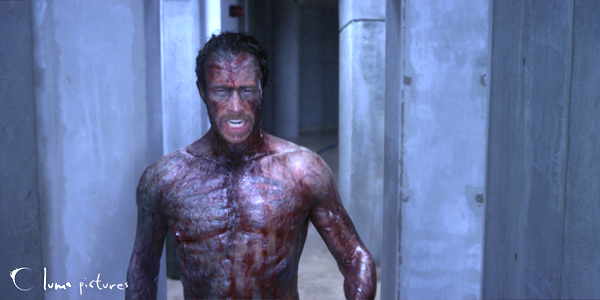 | Reverse Transformation The reverse transformation is unlike the first transformation in that it doesn’t use the middle step. The creative vision for the reversed transformation was that it should be more of a ‘fading out’, in which the hybrid desperately tries to heal himself while he’s drained of blood and ultimately dies. During this struggle to heal, he slips back into human form. In the following sequence, the young Lycan-vampire Eve rips the throat from the Hybrid before he transforms back into a dead Dr Lane. Fido modified the assets for both the monster and Dr Lane with a large sculptured hole in the throat and chest and added torn flesh and blood details. “Fido had experience working on stereoscopic pictures from our involvement in Sir David Attenborough’s documentary ‘Flying Monsters 3D’, and this helped us considerably. A lot of the material in ‘Underworld: Awakening’ was shot at very high resolution and at 77 fr/sec. This simplified the tracking process, but also put pressure on Fido’s pipeline and technical capacity and since all shots were stereo, it took twice as much space compared to other projects,” said Staffan. Fido has worked with very high resolution media for some time and developed their own workflow and asset management system called Ftrack (www.ftrack.com) enabling them to handle projects of all sizes, and is very helpful in projects like these, especially with tight deadlines. Fight Sequence Lakeshore asked Luma to make a concept design for the new face, and based on this, Magnus Eriksson at Fido created a CG replacement. Staffan said, “We modelled a 3D interpretation in ZBrush while preserving the impact of the original concept, which was basically an overpaint from one of the frames.” Further details were added to make it more convincing and Staffan added small animated pieces of flesh to hang from the face, covered in blood. Since Fido’s shots weren’t originally intended as VFX shots, they also had to overcome the lack of tracking markers or other technical data when tracking the shots. They had to rotomate most of the transform and throat-ripping shots by hand in Maya and stabilize them later in the composite, which was time consuming, and by the time they did the facial replacement shots they decided to use object tracking. They relied on a combination of Match Mover, Maya and Nuke for tracking and match moving. |