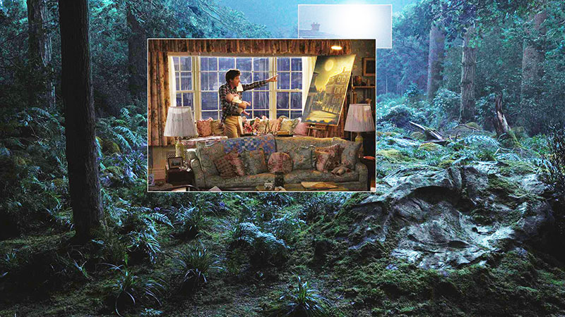 The team shot the interior of the house on two sound stages at Pinewood Studios. The window exterior was an LED wall, used to project images portraying over 80 different eras, weathers and times of day in the neighbourhood.